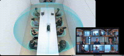 Two FHD screens positioned beneath the camera promote face-to-face collaboration, displaying the meeting while showing local users’ faces to remote attendees.